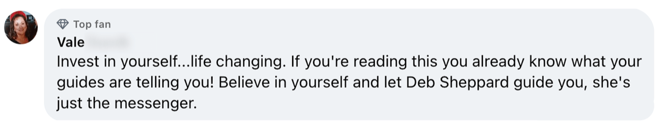 Deb Sheppard is an internationally recognized certified medium, spiritual teacher, author and speaker. Having completed well over 55,000 readings over the past 21 years, she connects her private clients and audiences from around the world to their loved ones in spirit, helping bring life full circle. Her incredible ability places her in the top 3% most accurate in her profession.