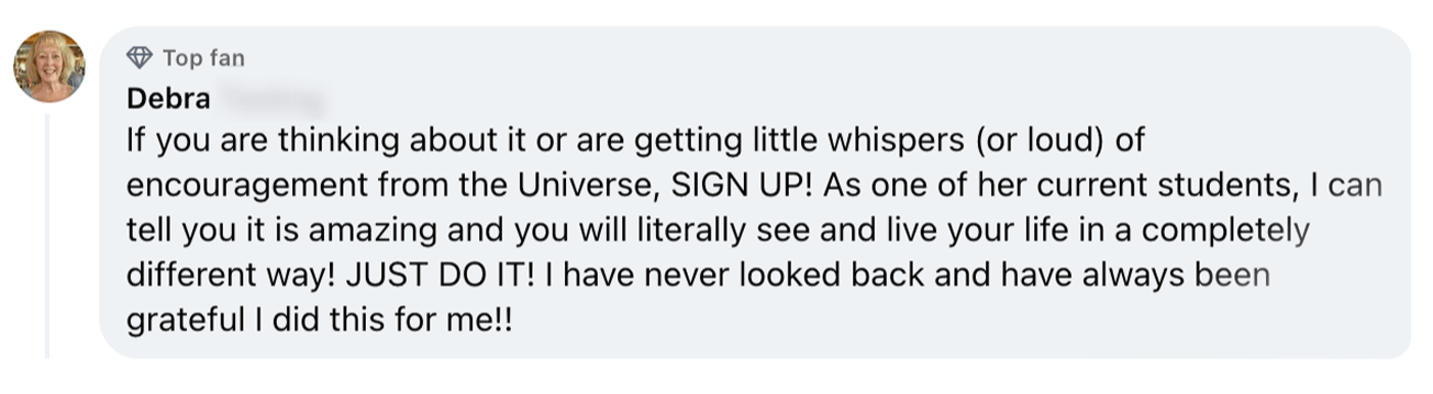 You also have the option to upgrade and receive private ongoing support and psychic mediumship insights from me through monthly one-on-one sessions. During these personal 1 hour sessions, I'll help you more deeply integrate the teachings and share messages and intuitive guidance.